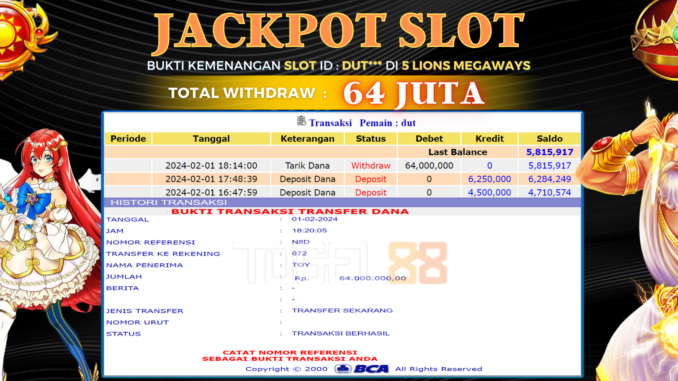 MEMBER TOGEL88 MENERIMA PELUNASAN JACKPOT SLOT DI 5 LIONS MEGAWAYS Rp 64.000.000,- LUNAS