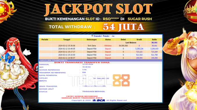 TOGEL88 mengucapkan selamat kepada user id : RSO*** yang telah berhasil mendapatkan jackpot pada permainan SLOT di SUGAR RUSH. Kemenangan sebesar Rp 54.000.000,-. telah dibayarkan LUNAS oleh pihak TOGEL88 kepada pemilik user id setelah yang bersangkutan mengisi formulir withdraw. Proses pencairan dana berlangsung sangat cepat hanya dalam waktu 5-10 menit sudah berada dalam rekening pemilik user id. Bukti transfer yang dapat anda lihat adalah bukti SAH / VALID yang langsung di dapatkan melalui bukti transaksi dari Bank yang digunakan untuk pengiriman dana pada rekening pemilik user id. Terima kasih kami sampaikan kepada para pengguna setia TOGEL88 yang telah menggunakan situs kami, sebagai Bandar Terpercaya yang pastinya membayar semua kemenangan member hingga lunas. Apakah TOGEL88 PENIPU ? Reputasi “TOGEL88 TERPERCAYA” sudah sangat melekat. puluhan hingga ratusan ribu pengguna setia TOGEL88 tetap menggunakan situs terbesar dan terbaik di Indonesia ini. Hapus rasa was-was dan khawatir anda, kemenangan anda berapapun PASTI dibayarkan hingga lunas.