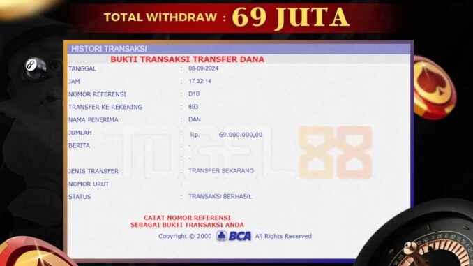 TOGEL88 mengucapkan selamat kepada user id : DAN*** yang telah berhasil mendapatkan jackpot pada permainan LIVE CASINO DI ROULETTE. Kemenangan sebesar Rp 69.000.000,-. telah dibayarkan LUNAS oleh pihak TOGEL88 kepada pemilik user id setelah yang bersangkutan mengisi formulir withdraw. Proses pencairan dana berlangsung sangat cepat hanya dalam waktu 5-10 menit sudah berada dalam rekening pemilik user id. Bukti transfer yang dapat anda lihat adalah bukti SAH / VALID yang langsung di dapatkan melalui bukti transaksi dari Bank yang digunakan untuk pengiriman dana pada rekening pemilik user id. Terima kasih kami sampaikan kepada para pengguna setia TOGEL88 yang telah menggunakan situs kami, sebagai Bandar Terpercaya yang pastinya membayar semua kemenangan member hingga lunas. Apakah TOGEL88 PENIPU ? Reputasi “TOGEL88 TERPERCAYA” sudah sangat melekat. puluhan hingga ratusan ribu pengguna setia TOGEL88 tetap menggunakan situs terbesar dan terbaik di Indonesia ini. Hapus rasa was-was dan khawatir anda, kemenangan anda berapapun PASTI dibayarkan hingga lunas.