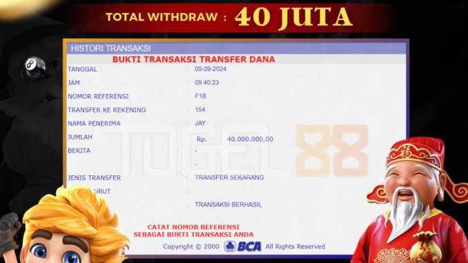 TOGEL88 mengucapkan selamat kepada user id : JAY*** yang telah berhasil mendapatkan jackpot pada permainan SLOT DI GATES OF OLYMPUS. Kemenangan sebesar Rp 40.000.000,-. telah dibayarkan LUNAS oleh pihak TOGEL88 kepada pemilik user id setelah yang bersangkutan mengisi formulir withdraw. Proses pencairan dana berlangsung sangat cepat hanya dalam waktu 5-10 menit sudah berada dalam rekening pemilik user id. Bukti transfer yang dapat anda lihat adalah bukti SAH / VALID yang langsung di dapatkan melalui bukti transaksi dari Bank yang digunakan untuk pengiriman dana pada rekening pemilik user id. Terima kasih kami sampaikan kepada para pengguna setia TOGEL88 yang telah menggunakan situs kami, sebagai Bandar Terpercaya yang pastinya membayar semua kemenangan member hingga lunas. Apakah TOGEL88 PENIPU ? Reputasi “TOGEL88 TERPERCAYA” sudah sangat melekat. puluhan hingga ratusan ribu pengguna setia TOGEL88 tetap menggunakan situs terbesar dan terbaik di Indonesia ini. Hapus rasa was-was dan khawatir anda, kemenangan anda berapapun PASTI dibayarkan hingga lunas.
