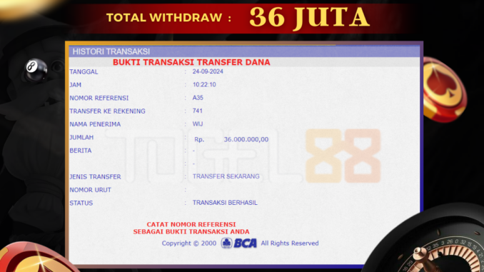 TOGEL88 mengucapkan selamat kepada user id : WIJ*** yang telah berhasil mendapatkan jackpot pada permainan LIVE CASINO DI 48D . Kemenangan sebesar Rp 36.000.000,-. telah dibayarkan LUNAS oleh pihak TOGEL88 kepada pemilik user id setelah yang bersangkutan mengisi formulir withdraw. Proses pencairan dana berlangsung sangat cepat hanya dalam waktu 5-10 menit sudah berada dalam rekening pemilik user id. Bukti transfer yang dapat anda lihat adalah bukti SAH / VALID yang langsung di dapatkan melalui bukti transaksi dari Bank yang digunakan untuk pengiriman dana pada rekening pemilik user id. Terima kasih kami sampaikan kepada para pengguna setia TOGEL88 yang telah menggunakan situs kami, sebagai Bandar Terpercaya yang pastinya membayar semua kemenangan member hingga lunas. Apakah TOGEL88 PENIPU ? Reputasi “TOGEL88 TERPERCAYA” sudah sangat melekat. puluhan hingga ratusan ribu pengguna setia TOGEL88 tetap menggunakan situs terbesar dan terbaik di Indonesia ini. Hapus rasa was-was dan khawatir anda, kemenangan anda berapapun PASTI dibayarkan hingga lunas.