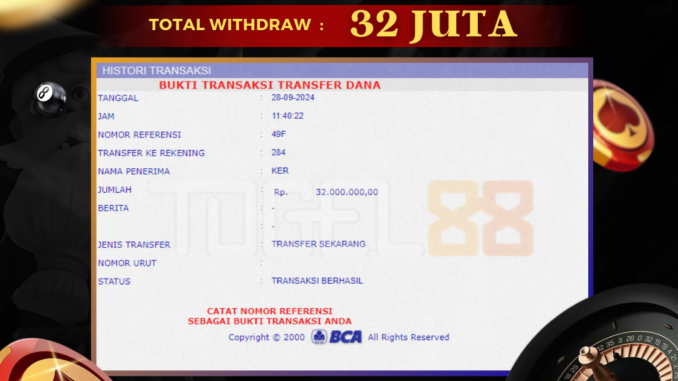 TOGEL88 mengucapkan selamat kepada user id : KER*** yang telah berhasil mendapatkan jackpot pada permainan LIVE CASINO DI BACCARAT EUROPE. Kemenangan sebesar Rp 32.000.000,-. telah dibayarkan LUNAS oleh pihak TOGEL88 kepada pemilik user id setelah yang bersangkutan mengisi formulir withdraw. Proses pencairan dana berlangsung sangat cepat hanya dalam waktu 5-10 menit sudah berada dalam rekening pemilik user id. Bukti transfer yang dapat anda lihat adalah bukti SAH / VALID yang langsung di dapatkan melalui bukti transaksi dari Bank yang digunakan untuk pengiriman dana pada rekening pemilik user id. Terima kasih kami sampaikan kepada para pengguna setia TOGEL88 yang telah menggunakan situs kami, sebagai Bandar Terpercaya yang pastinya membayar semua kemenangan member hingga lunas. Apakah TOGEL88 PENIPU ? Reputasi “TOGEL88 TERPERCAYA” sudah sangat melekat. puluhan hingga ratusan ribu pengguna setia TOGEL88 tetap menggunakan situs terbesar dan terbaik di Indonesia ini. Hapus rasa was-was dan khawatir anda, kemenangan anda berapapun PASTI dibayarkan hingga lunas.