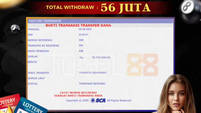 TOGEL88 mengucapkan selamat kepada user id : IMB*** yang telah berhasil mendapatkan jackpot pada permainan TOGEL di OHIO 4D. Kemenangan sebesar Rp 56.000.000,-. telah dibayarkan LUNAS oleh pihak TOGEL88 kepada pemilik user id setelah yang bersangkutan mengisi formulir withdraw. Proses pencairan dana berlangsung sangat cepat hanya dalam waktu 5-10 menit sudah berada dalam rekening pemilik user id. Bukti transfer yang dapat anda lihat adalah bukti SAH / VALID yang langsung di dapatkan melalui bukti transaksi dari Bank yang digunakan untuk pengiriman dana pada rekening pemilik user id. Terima kasih kami sampaikan kepada para pengguna setia TOGEL88 yang telah menggunakan situs kami, sebagai Bandar Terpercaya yang pastinya membayar semua kemenangan member hingga lunas. Apakah TOGEL88 PENIPU ? Reputasi “TOGEL88 TERPERCAYA” sudah sangat melekat. puluhan hingga ratusan ribu pengguna setia TOGEL88 tetap menggunakan situs terbesar dan terbaik di Indonesia ini. Hapus rasa was-was dan khawatir anda, kemenangan anda berapapun PASTI dibayarkan hingga lunas.