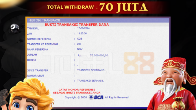 TOGEL88 mengucapkan selamat kepada user id : NOV*** yang telah berhasil mendapatkan jackpot pada permainan SLOT DI TIGER COPS. Kemenangan sebesar Rp 70.000.000,-. telah dibayarkan LUNAS oleh pihak TOGEL88 kepada pemilik user id setelah yang bersangkutan mengisi formulir withdraw. Proses pencairan dana berlangsung sangat cepat hanya dalam waktu 5-10 menit sudah berada dalam rekening pemilik user id. Bukti transfer yang dapat anda lihat adalah bukti SAH / VALID yang langsung di dapatkan melalui bukti transaksi dari Bank yang digunakan untuk pengiriman dana pada rekening pemilik user id. Terima kasih kami sampaikan kepada para pengguna setia TOGEL88 yang telah menggunakan situs kami, sebagai Bandar Terpercaya yang pastinya membayar semua kemenangan member hingga lunas. Apakah TOGEL88 PENIPU ? Reputasi “TOGEL88 TERPERCAYA” sudah sangat melekat. puluhan hingga ratusan ribu pengguna setia TOGEL88 tetap menggunakan situs terbesar dan terbaik di Indonesia ini. Hapus rasa was-was dan khawatir anda, kemenangan anda berapapun PASTI dibayarkan hingga lunas.