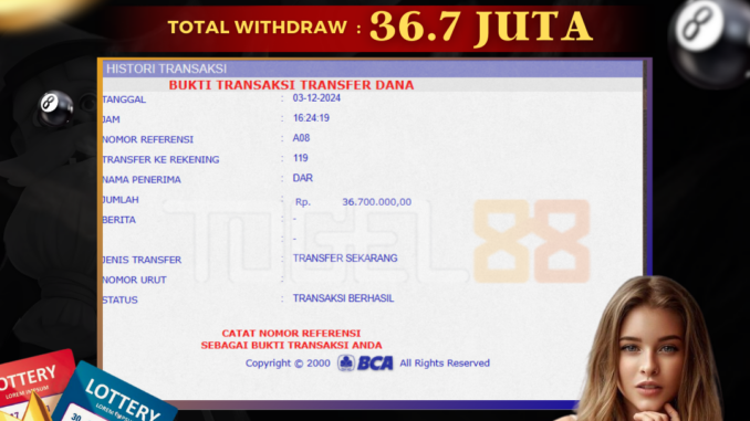 TOGEL88 mengucapkan selamat kepada user id : DAR*** yang telah berhasil mendapatkan jackpot pada permainan TOGEL DI SHIO HARIMAU. Kemenangan sebesar Rp 36.700.000,-. telah dibayarkan LUNAS oleh pihak TOGEL88 kepada pemilik user id setelah yang bersangkutan mengisi formulir withdraw. Proses pencairan dana berlangsung sangat cepat hanya dalam waktu 5-10 menit sudah berada dalam rekening pemilik user id. Bukti transfer yang dapat anda lihat adalah bukti SAH / VALID yang langsung di dapatkan melalui bukti transaksi dari Bank yang digunakan untuk pengiriman dana pada rekening pemilik user id. Terima kasih kami sampaikan kepada para pengguna setia TOGEL88 yang telah menggunakan situs kami, sebagai Bandar Terpercaya yang pastinya membayar semua kemenangan member hingga lunas. Apakah TOGEL88 PENIPU ? Reputasi “TOGEL88 TERPERCAYA” sudah sangat melekat. puluhan hingga ratusan ribu pengguna setia TOGEL88 tetap menggunakan situs terbesar dan terbaik di Indonesia ini. Hapus rasa was-was dan khawatir anda, kemenangan anda berapapun PASTI dibayarkan hingga lunas.