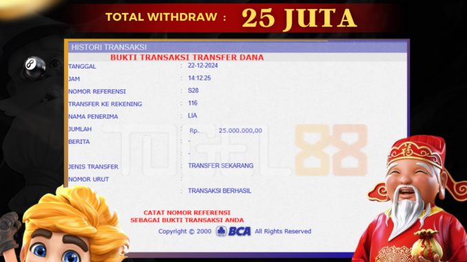 TOGEL88 mengucapkan selamat kepada user id : LIA*** yang telah berhasil mendapatkan jackpot pada permainan SLOT DI GATES OF OLYMPUS. Kemenangan sebesar Rp 25.000.000,-. telah dibayarkan LUNAS oleh pihak TOGEL88 kepada pemilik user id setelah yang bersangkutan mengisi formulir withdraw. Proses pencairan dana berlangsung sangat cepat hanya dalam waktu 5-10 menit sudah berada dalam rekening pemilik user id. Bukti transfer yang dapat anda lihat adalah bukti SAH / VALID yang langsung di dapatkan melalui bukti transaksi dari Bank yang digunakan untuk pengiriman dana pada rekening pemilik user id. Terima kasih kami sampaikan kepada para pengguna setia TOGEL88 yang telah menggunakan situs kami, sebagai Bandar Terpercaya yang pastinya membayar semua kemenangan member hingga lunas. Apakah TOGEL88 PENIPU ? Reputasi “TOGEL88 TERPERCAYA” sudah sangat melekat. puluhan hingga ratusan ribu pengguna setia TOGEL88 tetap menggunakan situs terbesar dan terbaik di Indonesia ini. Hapus rasa was-was dan khawatir anda, kemenangan anda berapapun PASTI dibayarkan hingga lunas.