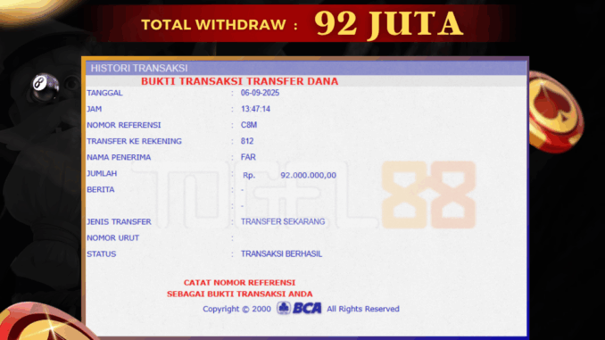 TOGEL88 mengucapkan selamat kepada user id : ETU*** yang telah berhasil mendapatkan jackpot pada permainan LIVE CASINO DI SHIO FIGHT. Kemenangan sebesar Rp 92.000.000,-. telah dibayarkan LUNAS oleh pihak TOGEL88 kepada pemilik user id setelah yang bersangkutan mengisi formulir withdraw. Proses pencairan dana berlangsung sangat cepat hanya dalam waktu 5-10 menit sudah berada dalam rekening pemilik user id. Bukti transfer yang dapat anda lihat adalah bukti SAH / VALID yang langsung di dapatkan melalui bukti transaksi dari Bank yang digunakan untuk pengiriman dana pada rekening pemilik user id. Terima kasih kami sampaikan kepada para pengguna setia TOGEL88 yang telah menggunakan situs kami, sebagai Bandar Terpercaya yang pastinya membayar semua kemenangan member hingga lunas. Apakah TOGEL88 PENIPU ? Reputasi “TOGEL88 TERPERCAYA” sudah sangat melekat. puluhan hingga ratusan ribu pengguna setia TOGEL88 tetap menggunakan situs terbesar dan terbaik di Indonesia ini. Hapus rasa was-was dan khawatir anda, kemenangan anda berapapun PASTI dibayarkan hingga lunas.