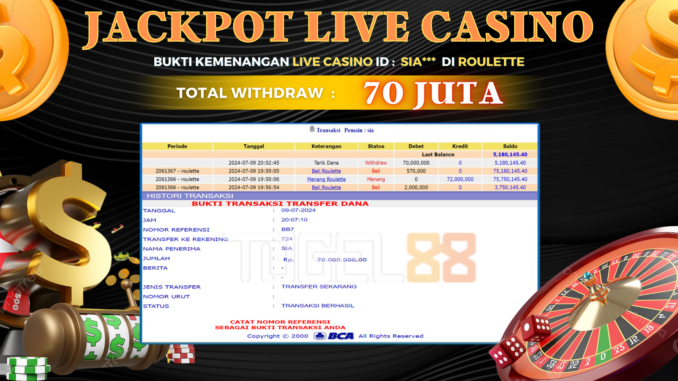 TOGEL88 mengucapkan selamat kepada user id : SIA*** yang telah berhasil mendapatkan jackpot pada permainan LIVE CASINO di ROULETTE. Kemenangan sebesar Rp 70.000.000,-. telah dibayarkan LUNAS oleh pihak TOGEL88 kepada pemilik user id setelah yang bersangkutan mengisi formulir withdraw. Proses pencairan dana berlangsung sangat cepat hanya dalam waktu 5-10 menit sudah berada dalam rekening pemilik user id. Bukti transfer yang dapat anda lihat adalah bukti SAH / VALID yang langsung di dapatkan melalui bukti transaksi dari Bank yang digunakan untuk pengiriman dana pada rekening pemilik user id. Terima kasih kami sampaikan kepada para pengguna setia TOGEL88 yang telah menggunakan situs kami, sebagai Bandar Terpercaya yang pastinya membayar semua kemenangan member hingga lunas. Apakah TOGEL88 PENIPU ? Reputasi “TOGEL88 TERPERCAYA” sudah sangat melekat. puluhan hingga ratusan ribu pengguna setia TOGEL88 tetap menggunakan situs terbesar dan terbaik di Indonesia ini. Hapus rasa was-was dan khawatir anda, kemenangan anda berapapun PASTI dibayarkan hingga lunas.