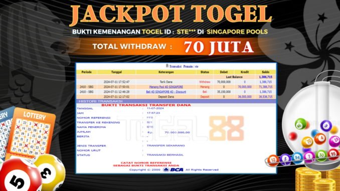 TOGEL88 mengucapkan selamat kepada user id : STE** yang telah berhasil mendapatkan jackpot pada permainan TOGEL di SINGAPORE POOLS. Kemenangan sebesar Rp 70.000.000,-. telah dibayarkan LUNAS oleh pihak TOGEL88 kepada pemilik user id setelah yang bersangkutan mengisi formulir withdraw. Proses pencairan dana berlangsung sangat cepat hanya dalam waktu 5-10 menit sudah berada dalam rekening pemilik user id. Bukti transfer yang dapat anda lihat adalah bukti SAH / VALID yang langsung di dapatkan melalui bukti transaksi dari Bank yang digunakan untuk pengiriman dana pada rekening pemilik user id. Terima kasih kami sampaikan kepada para pengguna setia TOGEL88 yang telah menggunakan situs kami, sebagai Bandar Terpercaya yang pastinya membayar semua kemenangan member hingga lunas. Apakah TOGEL88 PENIPU ? Reputasi “TOGEL88 TERPERCAYA” sudah sangat melekat. puluhan hingga ratusan ribu pengguna setia TOGEL88 tetap menggunakan situs terbesar dan terbaik di Indonesia ini. Hapus rasa was-was dan khawatir anda, kemenangan anda berapapun PASTI dibayarkan hingga lunas.