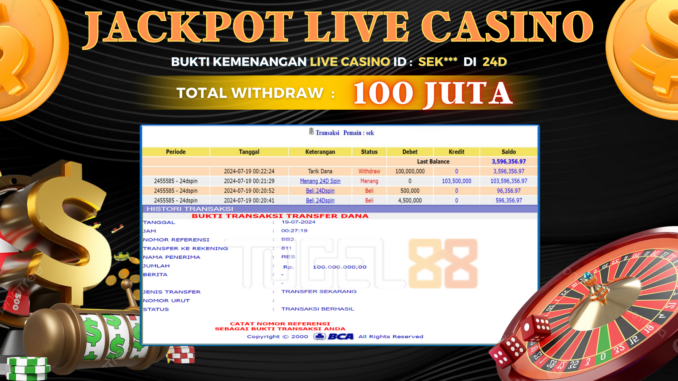 TOGEL88 JACKPOT SLOT DI LIVE CASINO di 24D Rp 100.000.000,- LUNAS