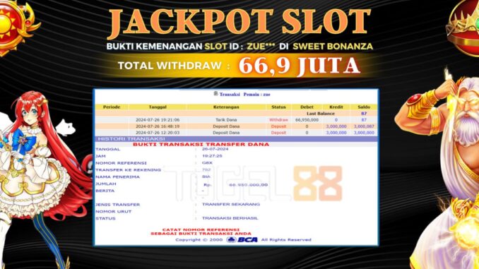 TOGEL88 mengucapkan selamat kepada user id : ZUE*** yang telah berhasil mendapatkan jackpot pada permainan SLOT DI SWEET BONANZA. Kemenangan sebesar Rp 66.900.000,-. telah dibayarkan LUNAS oleh pihak TOGEL88 kepada pemilik user id setelah yang bersangkutan mengisi formulir withdraw. Proses pencairan dana berlangsung sangat cepat hanya dalam waktu 5-10 menit sudah berada dalam rekening pemilik user id. Bukti transfer yang dapat anda lihat adalah bukti SAH / VALID yang langsung di dapatkan melalui bukti transaksi dari Bank yang digunakan untuk pengiriman dana pada rekening pemilik user id. Terima kasih kami sampaikan kepada para pengguna setia TOGEL88 yang telah menggunakan situs kami, sebagai Bandar Terpercaya yang pastinya membayar semua kemenangan member hingga lunas. Apakah TOGEL88 PENIPU ? Reputasi “TOGEL88 TERPERCAYA” sudah sangat melekat. puluhan hingga ratusan ribu pengguna setia TOGEL88 tetap menggunakan situs terbesar dan terbaik di Indonesia ini. Hapus rasa was-was dan khawatir anda, kemenangan anda berapapun PASTI dibayarkan hingga lunas.
