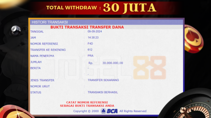 TOGEL88 mengucapkan selamat kepada user id : AHM*** yang telah berhasil mendapatkan jackpot pada permainan LIVE CASINO DI BACCARAT. Kemenangan sebesar Rp 42.000.000,-. telah dibayarkan LUNAS oleh pihak TOGEL88 kepada pemilik user id setelah yang bersangkutan mengisi formulir withdraw. Proses pencairan dana berlangsung sangat cepat hanya dalam waktu 5-10 menit sudah berada dalam rekening pemilik user id. Bukti transfer yang dapat anda lihat adalah bukti SAH / VALID yang langsung di dapatkan melalui bukti transaksi dari Bank yang digunakan untuk pengiriman dana pada rekening pemilik user id. Terima kasih kami sampaikan kepada para pengguna setia TOGEL88 yang telah menggunakan situs kami, sebagai Bandar Terpercaya yang pastinya membayar semua kemenangan member hingga lunas. Apakah TOGEL88 PENIPU ? Reputasi “TOGEL88 TERPERCAYA” sudah sangat melekat. puluhan hingga ratusan ribu pengguna setia TOGEL88 tetap menggunakan situs terbesar dan terbaik di Indonesia ini. Hapus rasa was-was dan khawatir anda, kemenangan anda berapapun PASTI dibayarkan hingga lunas.