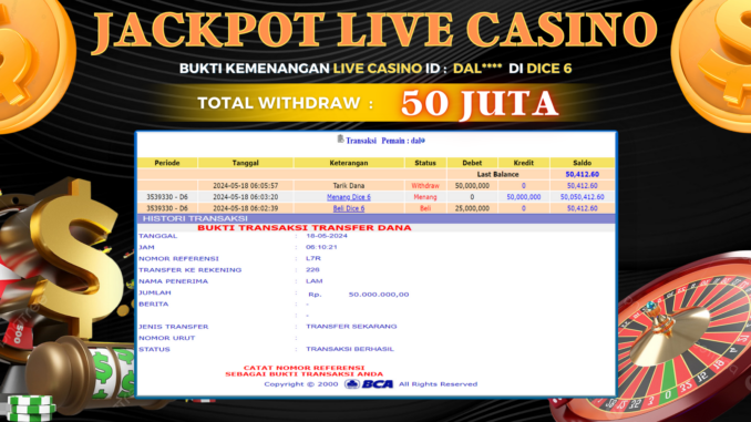 TOGEL88 JACKPOT LIVE CASINO DI DICE 6 Rp 50.000.000,- LUNAS