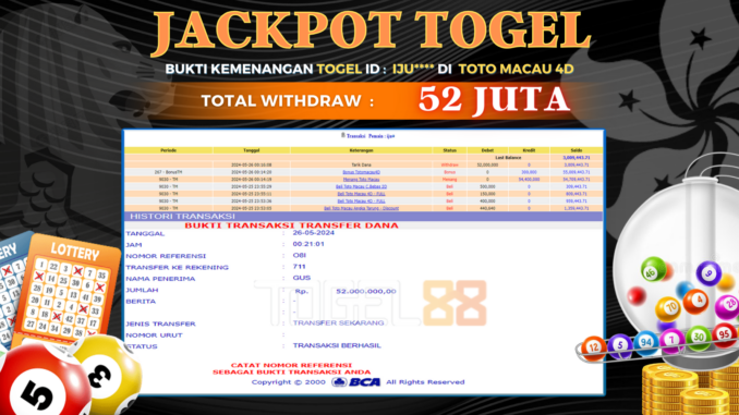 TOGEL88 JACKPOT TOGEL DI TOTO MACAU 4D Rp 52.000.000,- LUNAS