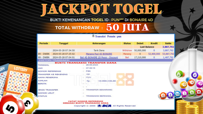 MEMBER TOGEL88 MENERIMA PELUNASAN KEMENANGAN JACKPOT TOGEL DI BONAIRE 4D Rp 50.000.000,- LUNAS