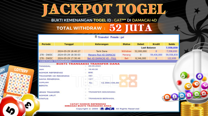 TOGEL88 JACKPOT TOGEL DI DAMACAI 4D Rp 52.000.000,- LUNAS