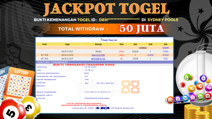 TOGEL88 mengucapkan selamat kepada user id : DEN*** yang telah berhasil mendapatkan jackpot pada permainan TOGEL DI SYDNEY POOLS. Kemenangan sebesar Rp 50.000.000,-. telah dibayarkan LUNAS oleh pihak TOGEL88 kepada pemilik user id setelah yang bersangkutan mengisi formulir withdraw. Proses pencairan dana berlangsung sangat cepat hanya dalam waktu 5-10 menit sudah berada dalam rekening pemilik user id. Bukti transfer yang dapat anda lihat adalah bukti SAH / VALID yang langsung di dapatkan melalui bukti transaksi dari Bank yang digunakan untuk pengiriman dana pada rekening pemilik user id. Terima kasih kami sampaikan kepada para pengguna setia TOGEL88 yang telah menggunakan situs kami, sebagai Bandar Terpercaya yang pastinya membayar semua kemenangan member hingga lunas. Apakah TOGEL88 PENIPU ? Reputasi “TOGEL88 TERPERCAYA” sudah sangat melekat. puluhan hingga ratusan ribu pengguna setia TOGEL88 tetap menggunakan situs terbesar dan terbaik di Indonesia ini. Hapus rasa was-was dan khawatir anda, kemenangan anda berapapun PASTI dibayarkan hingga lunas.