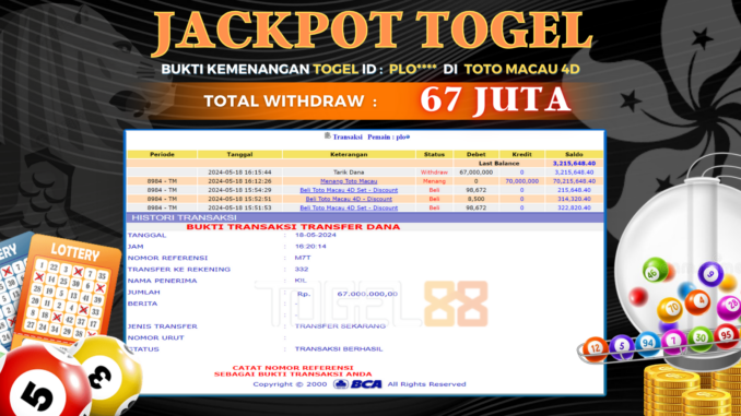 TOGEL88 JACKPOT TOGEL DI TOTO MACAU 4D Rp 67.000.000,- LUNAS