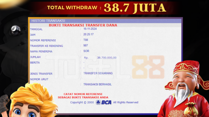 TOGEL88 mengucapkan selamat kepada user id : SOR*** yang telah berhasil mendapatkan jackpot pada permainan SLOT DI GATES OF GATOT KACA Kemenangan sebesar Rp 38.700.000,-. telah dibayarkan LUNAS oleh pihak TOGEL88 kepada pemilik user id setelah yang bersangkutan mengisi formulir withdraw. Proses pencairan dana berlangsung sangat cepat hanya dalam waktu 5-10 menit sudah berada dalam rekening pemilik user id. Bukti transfer yang dapat anda lihat adalah bukti SAH / VALID yang langsung di dapatkan melalui bukti transaksi dari Bank yang digunakan untuk pengiriman dana pada rekening pemilik user id. Terima kasih kami sampaikan kepada para pengguna setia TOGEL88 yang telah menggunakan situs kami, sebagai Bandar Terpercaya yang pastinya membayar semua kemenangan member hingga lunas. Apakah TOGEL88 PENIPU ? Reputasi “TOGEL88 TERPERCAYA” sudah sangat melekat. puluhan hingga ratusan ribu pengguna setia TOGEL88 tetap menggunakan situs terbesar dan terbaik di Indonesia ini. Hapus rasa was-was dan khawatir anda, kemenangan anda berapapun PASTI dibayarkan hingga lunas.