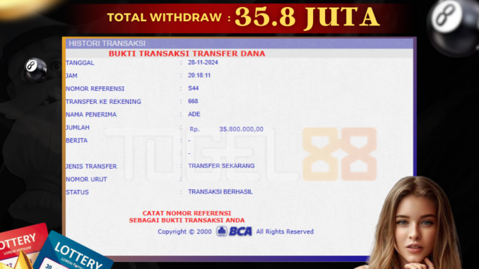 TOGEL88 mengucapkan selamat kepada user id : ADE*** yang telah berhasil mendapatkan jackpot pada permainan TOGEL DI SHIO AYAM. Kemenangan sebesar Rp 35.800.000,-. telah dibayarkan LUNAS oleh pihak TOGEL88 kepada pemilik user id setelah yang bersangkutan mengisi formulir withdraw. Proses pencairan dana berlangsung sangat cepat hanya dalam waktu 5-10 menit sudah berada dalam rekening pemilik user id. Bukti transfer yang dapat anda lihat adalah bukti SAH / VALID yang langsung di dapatkan melalui bukti transaksi dari Bank yang digunakan untuk pengiriman dana pada rekening pemilik user id. Terima kasih kami sampaikan kepada para pengguna setia TOGEL88 yang telah menggunakan situs kami, sebagai Bandar Terpercaya yang pastinya membayar semua kemenangan member hingga lunas. Apakah TOGEL88 PENIPU ? Reputasi “TOGEL88 TERPERCAYA” sudah sangat melekat. puluhan hingga ratusan ribu pengguna setia TOGEL88 tetap menggunakan situs terbesar dan terbaik di Indonesia ini. Hapus rasa was-was dan khawatir anda, kemenangan anda berapapun PASTI dibayarkan hingga lunas.