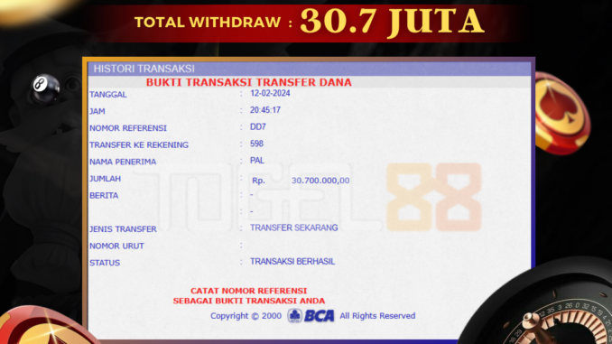 TOGEL88 mengucapkan selamat kepada user id : PAM*** yang telah berhasil mendapatkan jackpot pada permainan LIVE CASINO DI POKER DICE. Kemenangan sebesar Rp 30.700.000,-. telah dibayarkan LUNAS oleh pihak TOGEL88 kepada pemilik user id setelah yang bersangkutan mengisi formulir withdraw. Proses pencairan dana berlangsung sangat cepat hanya dalam waktu 5-10 menit sudah berada dalam rekening pemilik user id. Bukti transfer yang dapat anda lihat adalah bukti SAH / VALID yang langsung di dapatkan melalui bukti transaksi dari Bank yang digunakan untuk pengiriman dana pada rekening pemilik user id. Terima kasih kami sampaikan kepada para pengguna setia TOGEL88 yang telah menggunakan situs kami, sebagai Bandar Terpercaya yang pastinya membayar semua kemenangan member hingga lunas. Apakah TOGEL88 PENIPU ? Reputasi “TOGEL88 TERPERCAYA” sudah sangat melekat. puluhan hingga ratusan ribu pengguna setia TOGEL88 tetap menggunakan situs terbesar dan terbaik di Indonesia ini. Hapus rasa was-was dan khawatir anda, kemenangan anda berapapun PASTI dibayarkan hingga lunas.