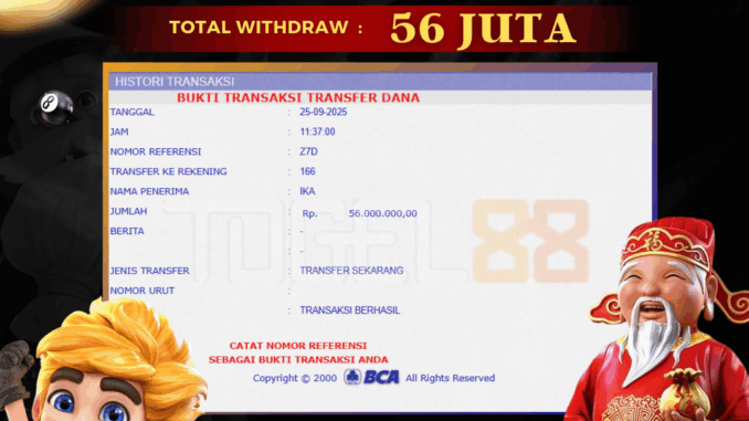 TOGEL88 mengucapkan selamat kepada user id : JOK*** yang telah berhasil mendapatkan jackpot pada permainan JACKPOT SLOT DI MOON PRINCESS. Kemenangan sebesar Rp 56.000.000,-. telah dibayarkan LUNAS oleh pihak TOGEL88 kepada pemilik user id setelah yang bersangkutan mengisi formulir withdraw. Proses pencairan dana berlangsung sangat cepat hanya dalam waktu 5-10 menit sudah berada dalam rekening pemilik user id. Bukti transfer yang dapat anda lihat adalah bukti SAH / VALID yang langsung di dapatkan melalui bukti transaksi dari Bank yang digunakan untuk pengiriman dana pada rekening pemilik user id. Terima kasih kami sampaikan kepada para pengguna setia TOGEL88 yang telah menggunakan situs kami, sebagai Bandar Terpercaya yang pastinya membayar semua kemenangan member hingga lunas. Apakah TOGEL88 PENIPU ? Reputasi “TOGEL88 TERPERCAYA” sudah sangat melekat. puluhan hingga ratusan ribu pengguna setia TOGEL88 tetap menggunakan situs terbesar dan terbaik di Indonesia ini. Hapus rasa was-was dan khawatir anda, kemenangan anda berapapun PASTI dibayarkan hingga lunas.
