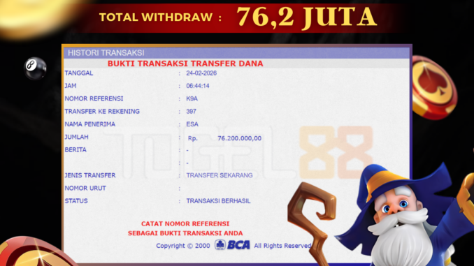 TOGEL88 mengucapkan selamat kepada user id : GIO*** yang telah berhasil mendapatkan jackpot pada permainan LIVE CASINO DI ROULETTE. Kemenangan sebesar Rp 76.200.000,-. telah dibayarkan LUNAS oleh pihak TOGEL88 kepada pemilik user id setelah yang bersangkutan mengisi formulir withdraw. Proses pencairan dana berlangsung sangat cepat hanya dalam waktu 5-10 menit sudah berada dalam rekening pemilik user id. Bukti transfer yang dapat anda lihat adalah bukti SAH / VALID yang langsung di dapatkan melalui bukti transaksi dari Bank yang digunakan untuk pengiriman dana pada rekening pemilik user id. Terima kasih kami sampaikan kepada para pengguna setia TOGEL88 yang telah menggunakan situs kami, sebagai Bandar Terpercaya yang pastinya membayar semua kemenangan member hingga lunas. Apakah TOGEL88 PENIPU ? Reputasi “TOGEL88 TERPERCAYA” sudah sangat melekat. puluhan hingga ratusan ribu pengguna setia TOGEL88 tetap menggunakan situs terbesar dan terbaik di Indonesia ini. Hapus rasa was-was dan khawatir anda, kemenangan anda berapapun PASTI dibayarkan hingga lunas.