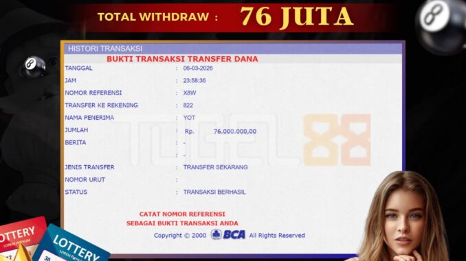 TOGEL88 mengucapkan selamat kepada user id : WAN*** yang telah berhasil mendapatkan jackpot pada permainan TOGEL DI KINGKONG POOLS. Kemenangan sebesar Rp 76.000.000,-. telah dibayarkan LUNAS oleh pihak TOGEL88 kepada pemilik user id setelah yang bersangkutan mengisi formulir withdraw. Proses pencairan dana berlangsung sangat cepat hanya dalam waktu 5-10 menit sudah berada dalam rekening pemilik user id. Bukti transfer yang dapat anda lihat adalah bukti SAH / VALID yang langsung di dapatkan melalui bukti transaksi dari Bank yang digunakan untuk pengiriman dana pada rekening pemilik user id. Terima kasih kami sampaikan kepada para pengguna setia TOGEL88 yang telah menggunakan situs kami, sebagai Bandar Terpercaya yang pastinya membayar semua kemenangan member hingga lunas. Apakah TOGEL88 PENIPU ? Reputasi “TOGEL88 TERPERCAYA” sudah sangat melekat. puluhan hingga ratusan ribu pengguna setia TOGEL88 tetap menggunakan situs terbesar dan terbaik di Indonesia ini. Hapus rasa was-was dan khawatir anda, kemenangan anda berapapun PASTI dibayarkan hingga lunas.