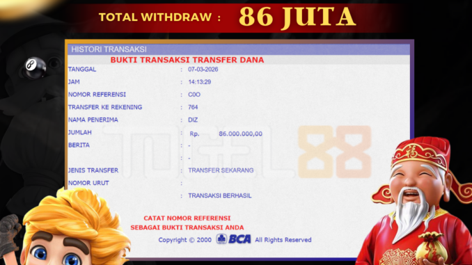 TOGEL88 mengucapkan selamat kepada user id : YIN*** yang telah berhasil mendapatkan jackpot pada permainan SLOT DI POWER OF ODIN. Kemenangan sebesar Rp 86.000.000,-. telah dibayarkan LUNAS oleh pihak TOGEL88 kepada pemilik user id setelah yang bersangkutan mengisi formulir withdraw. Proses pencairan dana berlangsung sangat cepat hanya dalam waktu 5-10 menit sudah berada dalam rekening pemilik user id. Bukti transfer yang dapat anda lihat adalah bukti SAH / VALID yang langsung di dapatkan melalui bukti transaksi dari Bank yang digunakan untuk pengiriman dana pada rekening pemilik user id. Terima kasih kami sampaikan kepada para pengguna setia TOGEL88 yang telah menggunakan situs kami, sebagai Bandar Terpercaya yang pastinya membayar semua kemenangan member hingga lunas. Apakah TOGEL88 PENIPU ? Reputasi “TOGEL88 TERPERCAYA” sudah sangat melekat. puluhan hingga ratusan ribu pengguna setia TOGEL88 tetap menggunakan situs terbesar dan terbaik di Indonesia ini. Hapus rasa was-was dan khawatir anda, kemenangan anda berapapun PASTI dibayarkan hingga lunas.