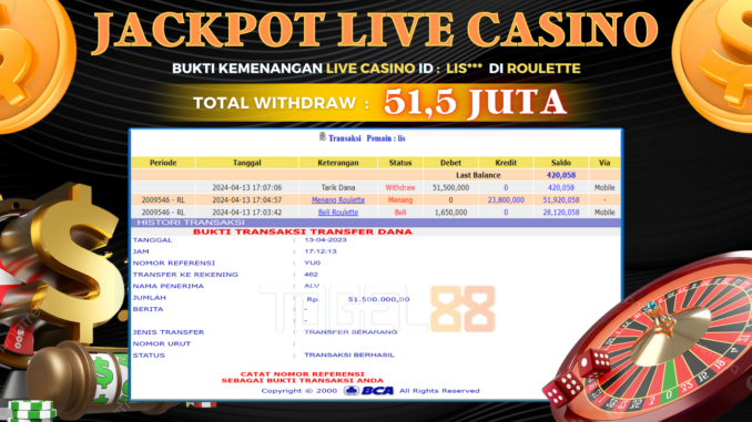 TOGEL88 JACKPOT LIVE CASINO DI ROULETTE Rp 51.500.000,- LUNAS