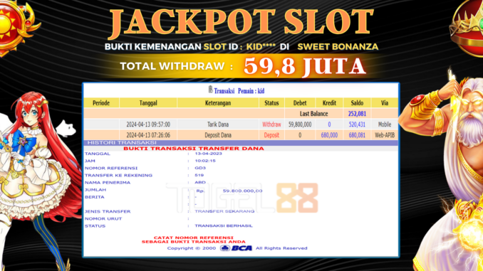 TOGEL88 mengucapkan selamat kepada user id : KID*** yang telah berhasil mendapatkan jackpot pada permainan SLOT DI SWEET BONANZA. Kemenangan sebesar Rp 59.800.000,-. telah dibayarkan LUNAS oleh pihak TOGEL88 kepada pemilik user id setelah yang bersangkutan mengisi formulir withdraw. Proses pencairan dana berlangsung sangat cepat hanya dalam waktu 5-10 menit sudah berada dalam rekening pemilik user id. Bukti transfer yang dapat anda lihat adalah bukti SAH / VALID yang langsung di dapatkan melalui bukti transaksi dari Bank yang digunakan untuk pengiriman dana pada rekening pemilik user id. Terima kasih kami sampaikan kepada para pengguna setia TOGEL88 yang telah menggunakan situs kami, sebagai Bandar Terpercaya yang pastinya membayar semua kemenangan member hingga lunas. Apakah TOGEL88 PENIPU ? Reputasi “TOGEL88 TERPERCAYA” sudah sangat melekat. puluhan hingga ratusan ribu pengguna setia TOGEL88 tetap menggunakan situs terbesar dan terbaik di Indonesia ini. Hapus rasa was-was dan khawatir anda, kemenangan anda berapapun PASTI dibayarkan hingga lunas.