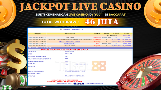 TOGEL88 JACKPOT LIVE CASINO DI BACCARAT Rp 46.000.000,- LUNAS