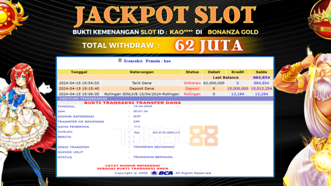TOGEL88 JACKPOT SLOT DI BONANZA GOLD Rp 62.000.000,- LUNAS