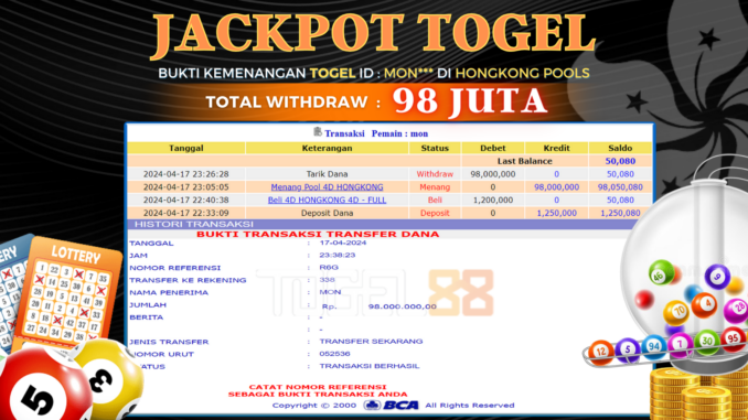 TOGEL88 JACKPOT TOGEL DI HONGKONG POOLS Rp 98.000.000,- LUNAS