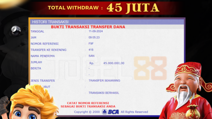 TOGEL88 mengucapkan selamat kepada user id : SAN*** yang telah berhasil mendapatkan jackpot pada permainan SLOT DI SUGAR RUSH. Kemenangan sebesar Rp 45.000.000,-. telah dibayarkan LUNAS oleh pihak TOGEL88 kepada pemilik user id setelah yang bersangkutan mengisi formulir withdraw. Proses pencairan dana berlangsung sangat cepat hanya dalam waktu 5-10 menit sudah berada dalam rekening pemilik user id. Bukti transfer yang dapat anda lihat adalah bukti SAH / VALID yang langsung di dapatkan melalui bukti transaksi dari Bank yang digunakan untuk pengiriman dana pada rekening pemilik user id. Terima kasih kami sampaikan kepada para pengguna setia TOGEL88 yang telah menggunakan situs kami, sebagai Bandar Terpercaya yang pastinya membayar semua kemenangan member hingga lunas. Apakah TOGEL88 PENIPU ? Reputasi “TOGEL88 TERPERCAYA” sudah sangat melekat. puluhan hingga ratusan ribu pengguna setia TOGEL88 tetap menggunakan situs terbesar dan terbaik di Indonesia ini. Hapus rasa was-was dan khawatir anda, kemenangan anda berapapun PASTI dibayarkan hingga lunas.